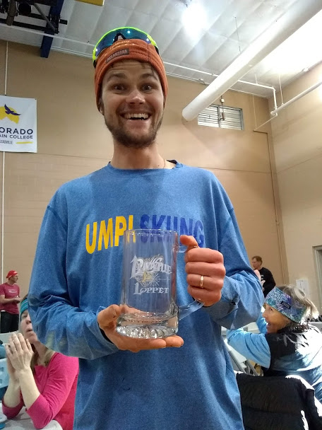The mayor was doing his usual thing of walking around the tables of hungry skiers, spouting off trivia questions, throwing chocolate bars to people blurting out the right answers, all in between announcing the age group winners for every race and raffle prize winners as well. The top three in each age group of each race walk away with a glass cup. Almost everyone gets a cup, and the awards take forever.