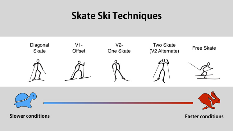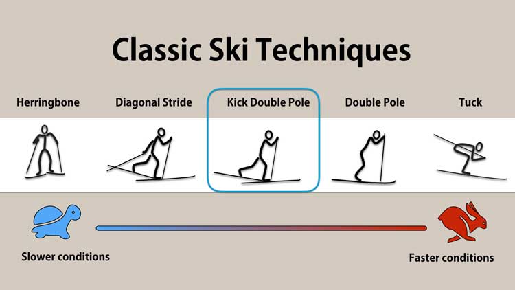 Each technique has four sub-techniques, or movement patterns, that correspond to speed and terrain. Let’s take a look at the four sub-techniques for classic skiing: