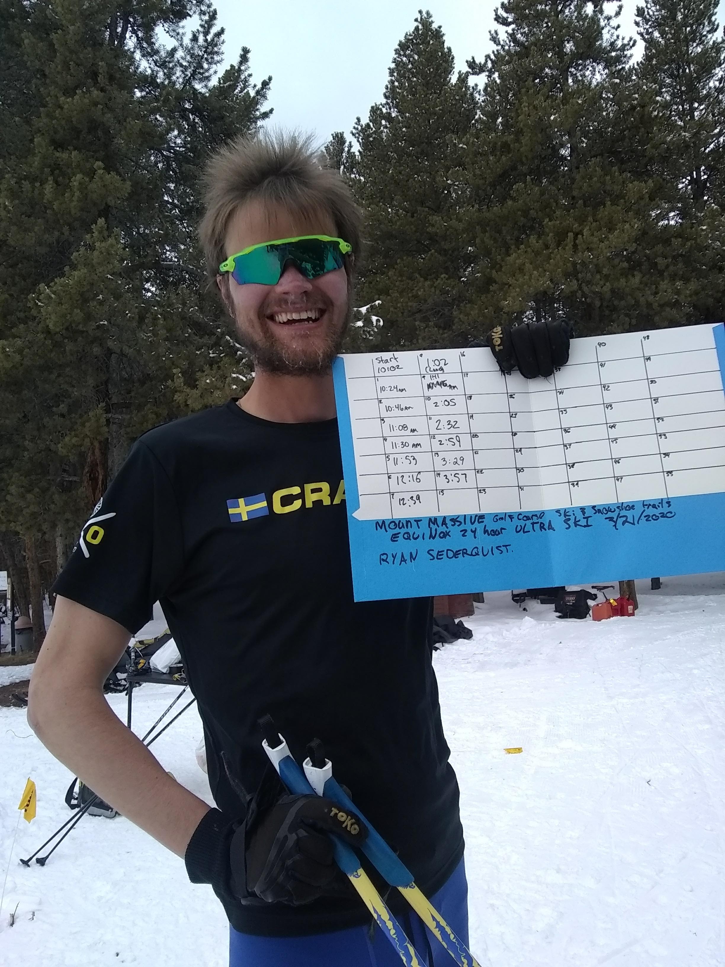 The race starts at 10:00 a.m. Saturday and concludes the following day at the same time. Sederquist plans on going “full-gas” until he reaches 100k, then doing a Quaker Oatmeal sponsor-bit to refuel, catch a nap and probably write some stories or do a podcast, and head back out when the snow gets fast again. He said he will use his USSPC company poles, which have aided him to all of his double-pole victories thus far. If he is out at night, he will light up the Mount Massive amphitheater with his Ledlenser headlamp.