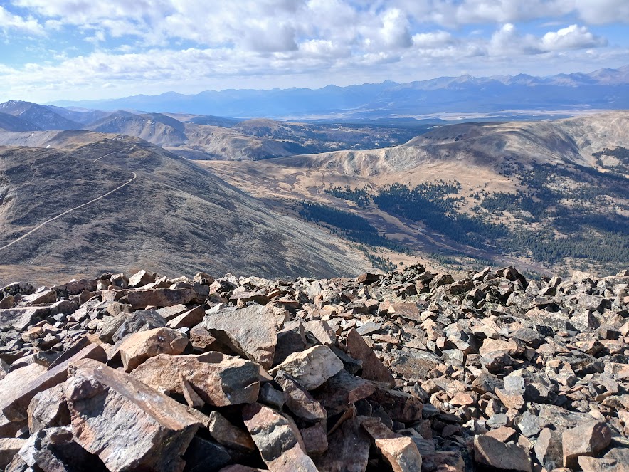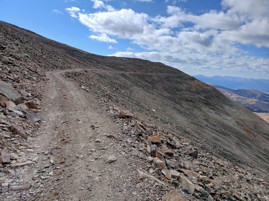 That joyous section was over too soon, however, as the road curved past some old equipment and called me upwards. I found a scramble scree of a singletrack, which I followed to the top of Mosquito Peak, elev. 13,787 feet.